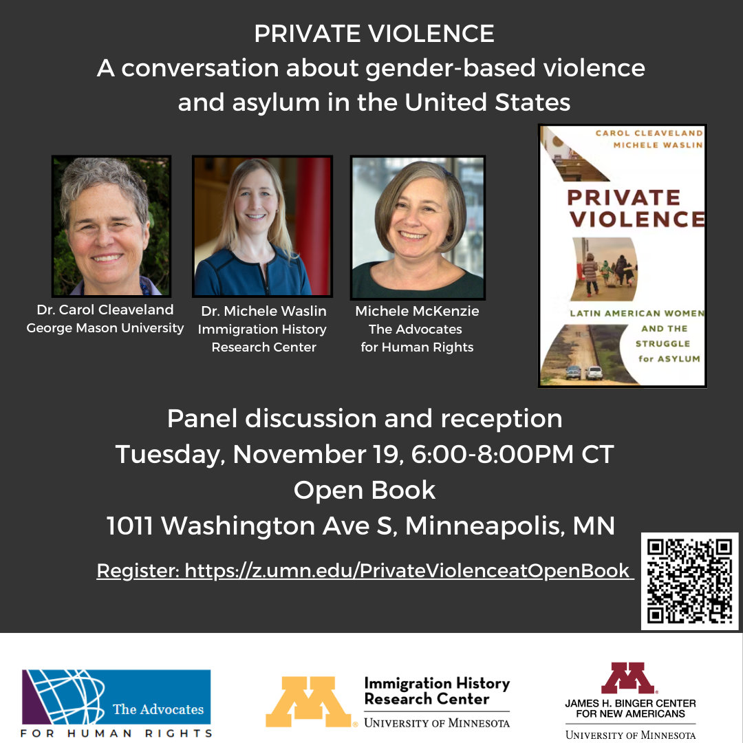 Join authors Dr. Carol Cleaveland, George Mason University and Dr. Michele Waslin, Immigration History Research Center at the University of Minnesota, together with Michele Garnett McKenzie, Deputy Director of The Advocates for Human Rights, for a panel discussion and reception. This event is co-sponsored by the Immigration History Research Center and the Binger Center for New Americans at the University of Minnesota and The Advocates for Human Rights.