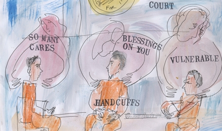 ![Immigration Court Website News Item.png [ai] A courtroom sketch showing a judge in a black robe, two individuals seated, and a lawyer's desk. A man in an orange jumpsuit is speaking. Text notes on the sketch reference legal status and options.](/Res/250/Immigration Court Website News Item 2.png)