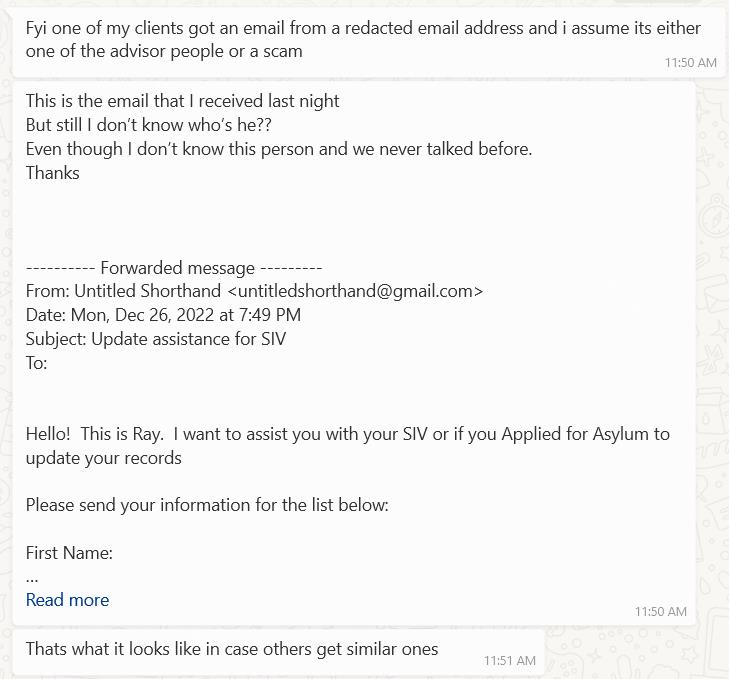 Screenshot of Possible Phishing Email for Afghan Special Immigrant Visa