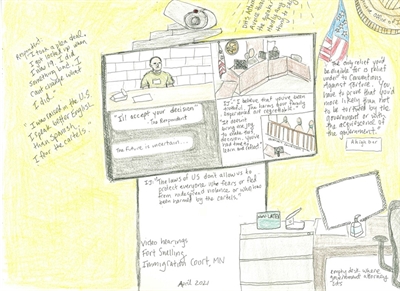 Court observers complete a two-page observation form for each observed hearing. Observers record demographic information such as gender, country of origin, and primary language; and objective information such as the presiding judge, counsel for the Department of Homeland Security (DHS), whether the person was represented, type of relief (defenses to deportation) being sought, bond requests and decisions, and criminal history. Observers also report subjective impressions about the person’s ability to understand and participate in the hearings, the treatment of the detained person, and the fairness of the process and outcome of the hearing. All collected observations are entered by volunteers into a database. Approximately every six months, the data are analyzed, and a stakeholder report is written. This report covers observed hearings at the Fort Snelling Immigration Court, in Minnesota, between September 1, 2020, and March 31, 2021.